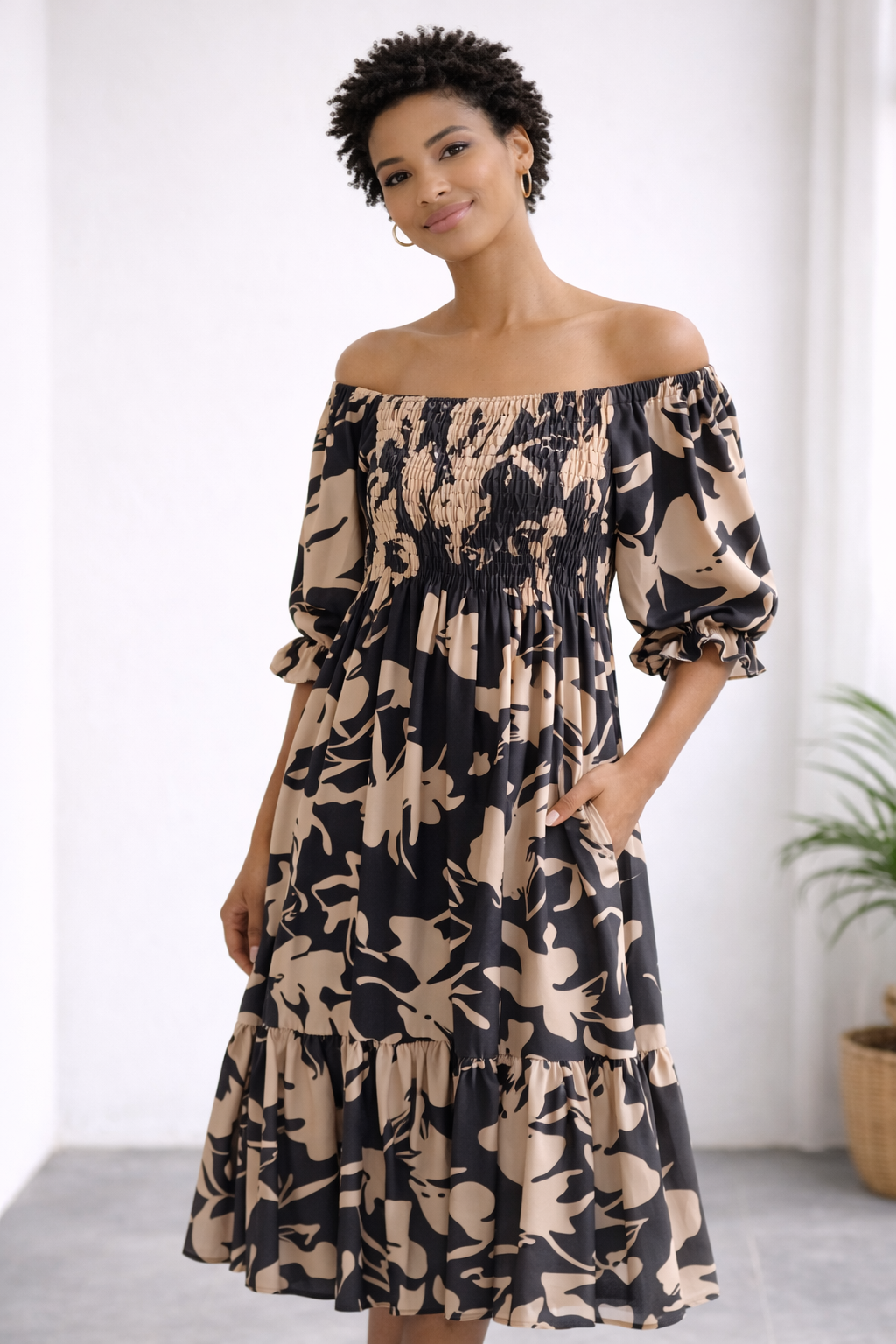 Robe mi-longue avek épaule découvert ek taille smock pou enn fit confortable. Design imprimé élégant ki donne ene look classy ek moderne. Parfait pou sortie, diner ouswa occasion special.
