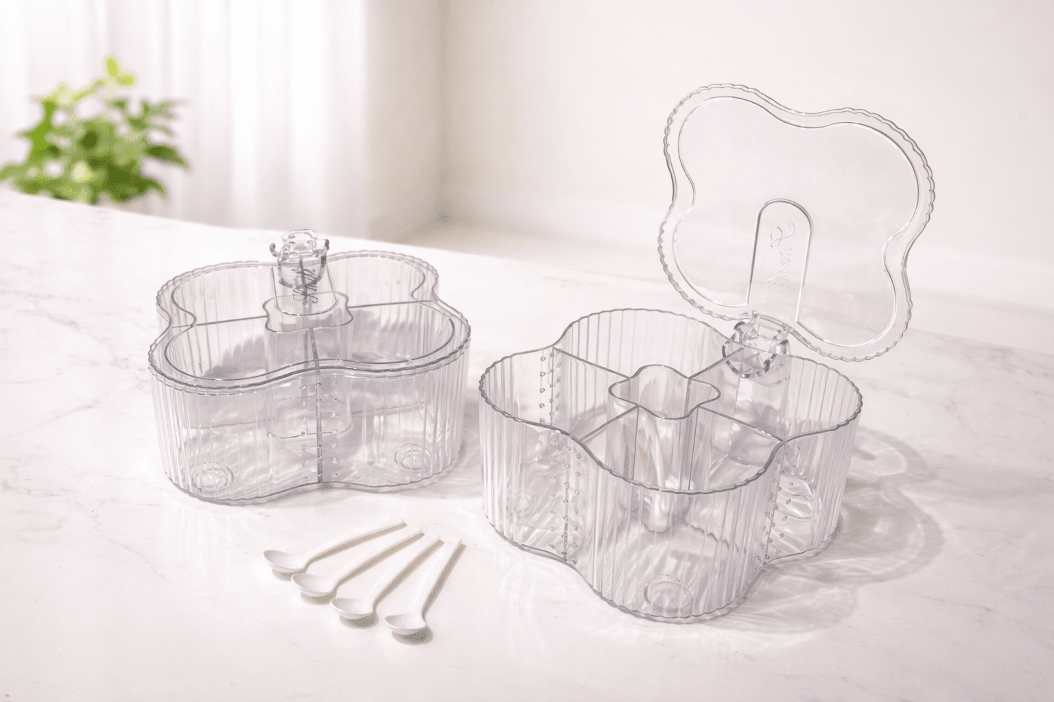 Boîte rangement transparente en forme fleur, avec 4 compartiments séparés et couvercle. Pratique pou garder épices, snacks ou petits accessoires bien organisés. ✨