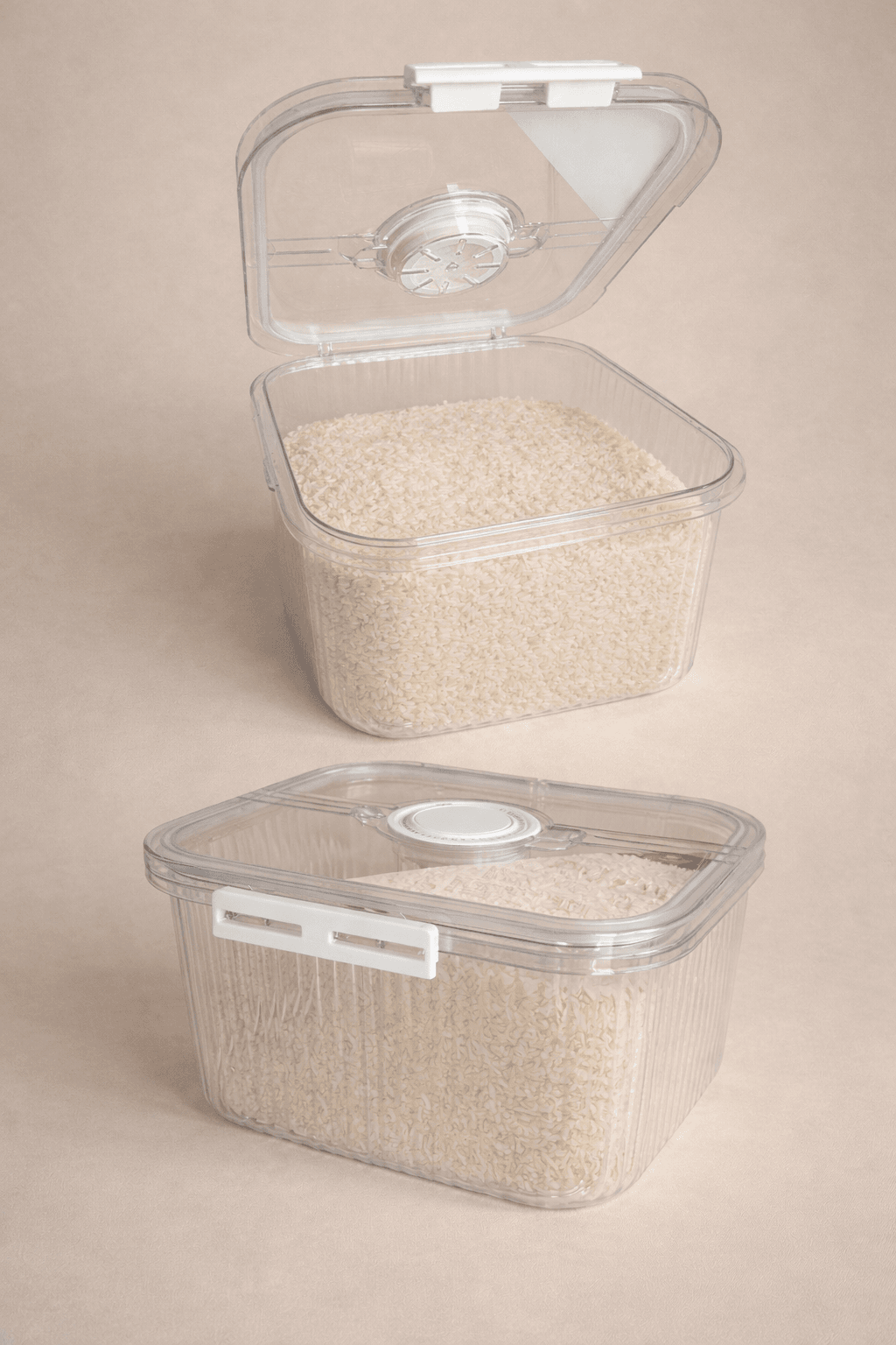 Bwat stokaz diri/farine transparent, avek couvercle bien ferme. Gard to diri\farine propre, sec ek bien organisé dan cuisine. Parfait pou usage quotidien.